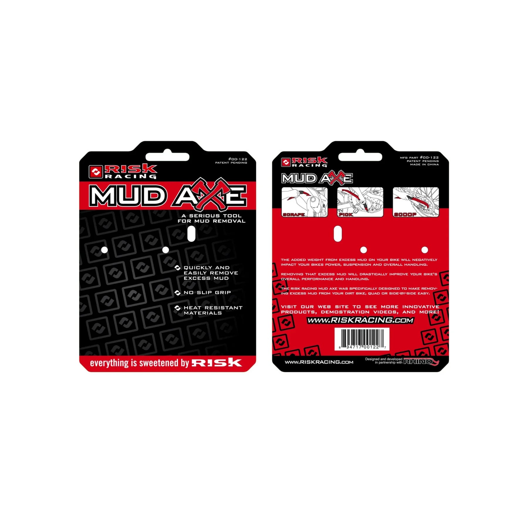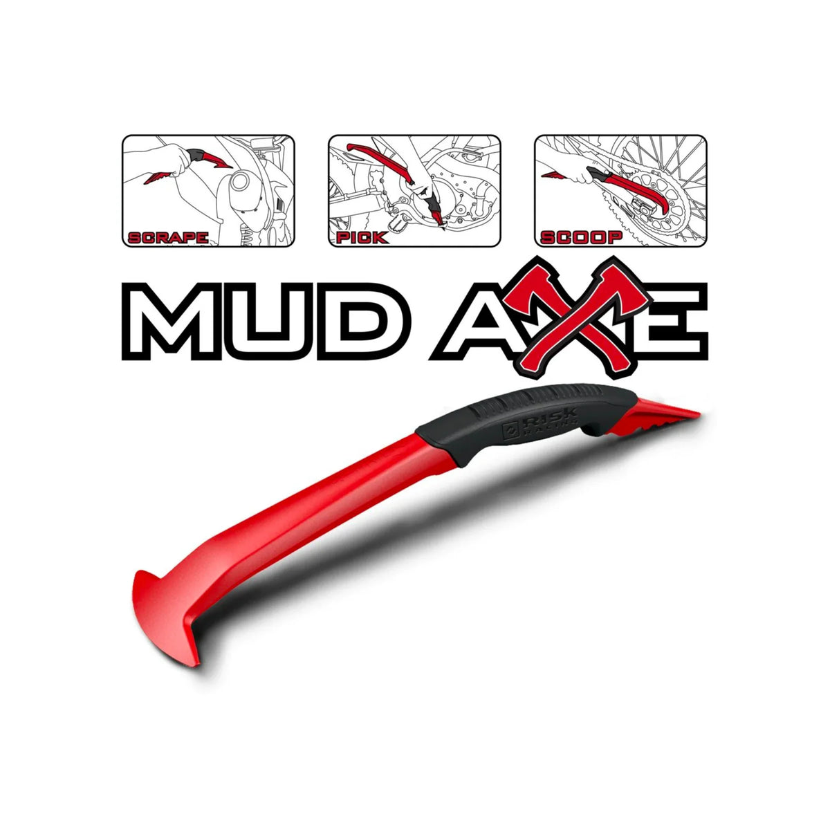 Removing the excess mud is always a dirty task. Historically, riders have used screwdrivers, sticks, or their bare hands to try and free their bikes from a thick coat of mud. All of these methods are inefficient and slow. Even when using a power washer, removing the majority of the mud first is a huge time saver, especially when water is in limited supply at the track. Luckily, Risk Racing now offers an alternative to screwdrivers and sticks with the new Mud Axe. The Risk Racing Mud Axe is specifically designed to make the task of removing excess mud from your dirt bike, quad or UTV quick and easy.