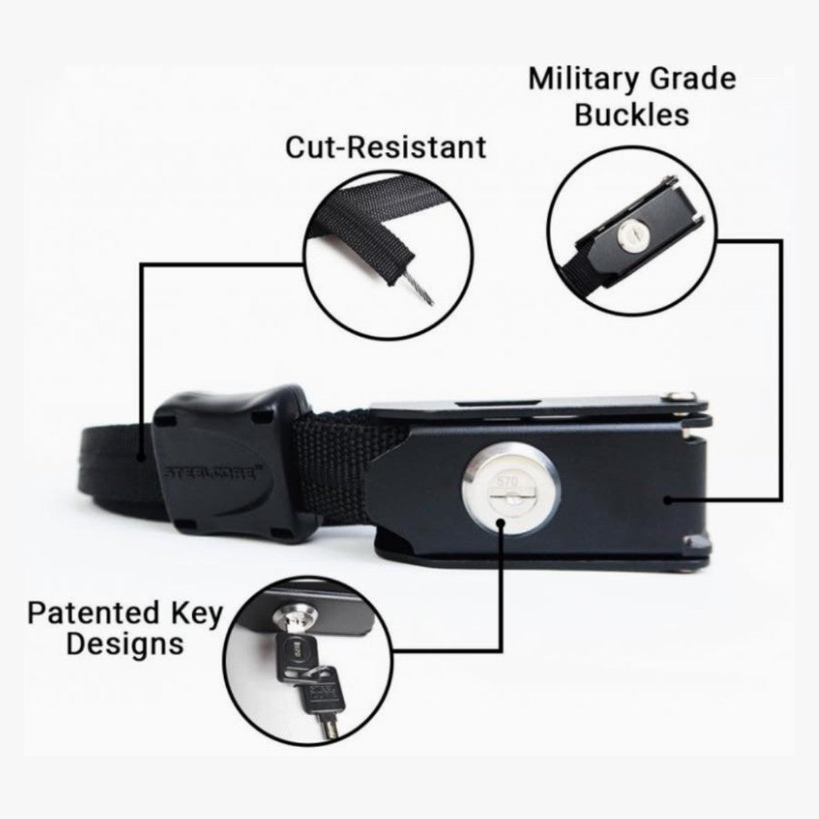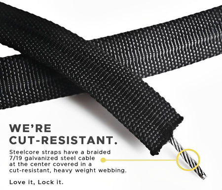 - Lockable straps with SEW (steel encased webbing) - harder to cut through than steel cable alone.