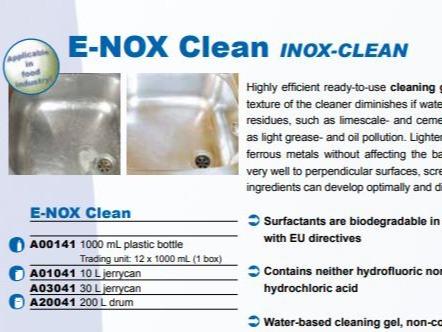 Highly effective, ready-to-use cleaning gel (can be diluted with water up to 1:40; the gel-like, viscous consistency of the cleaner will decrease as water is added though) for removing mineral residues, such as limescale- and cement residues, extraneous rust, and also light grease- and oil contaminations. Brightens stainless steel, aluminium and non-ferrous metals without affecting the basic metal. Non-corrosive on iron, V2A steel, non-ferrous metals and aluminium; will not dissolve gypsum- and silicate deposits. The cleaning gel adheres very well to perpendicular surfaces, screens, rollers, etc. This way, the active ingredients can work optimally, and the contaminations are dissolved without scrubbing or scouring, and removed without leaving scratches.