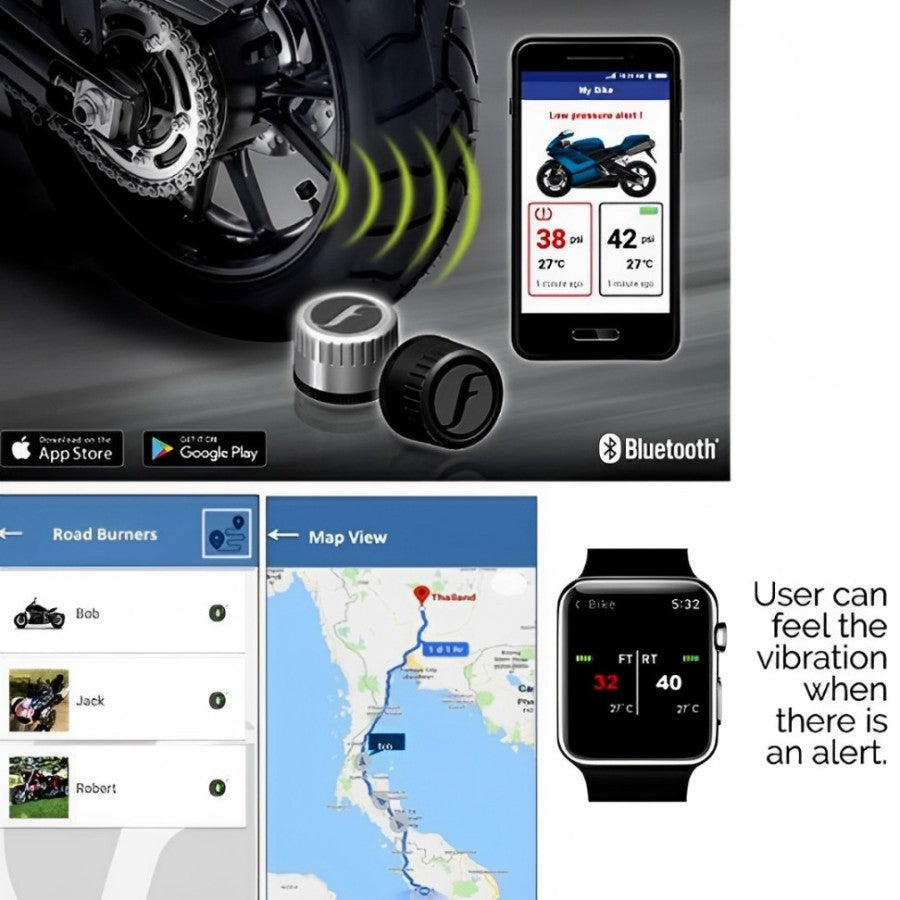 FOBO Bike 2 is a SMART tire pressure monitoring system (TPMS) for every biker (two wheeler) using latest Bluetooth 5.0 that works directly with your smart device using Android 5.0 and iOS 9.3 or later.